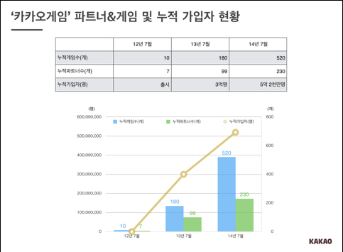 숫자로 보면 이해가 쉽다. 2012년 7월 7개 파트너와 10개 게임으로 출발한 카카오게임은 현재 230여개 파트너와 520개의 게임을 제공하고 있으며 누적 가입자 5억2000만명, 월 평균 순이용자 2000만명을 보유한 국내 대표 모바일 게임 플랫폼으로 자리잡았다.
