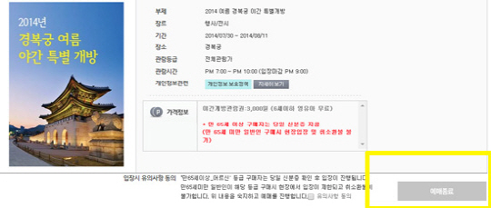 경복궁 야간개장을 앞두고 경복궁의 입장권 예매가 23일 오후 2시부터 옥션 티켓 예매사이트에서 시작된 가운데, 예매를 하려는 네티즌들이 한꺼번에 몰리며 예매창이 뜨지 않아 예매자들의 불만이 폭주했다. 현재(오후 3시 30분 기준) 옥션티켓은 예매가 종료된 상태다.