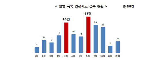 이 가운데 월별 발생빈도로 살펴보면 8월에 발생한 경우가 총 31건으로 가장 많았고, 5월(26건)이 그 다음이다.