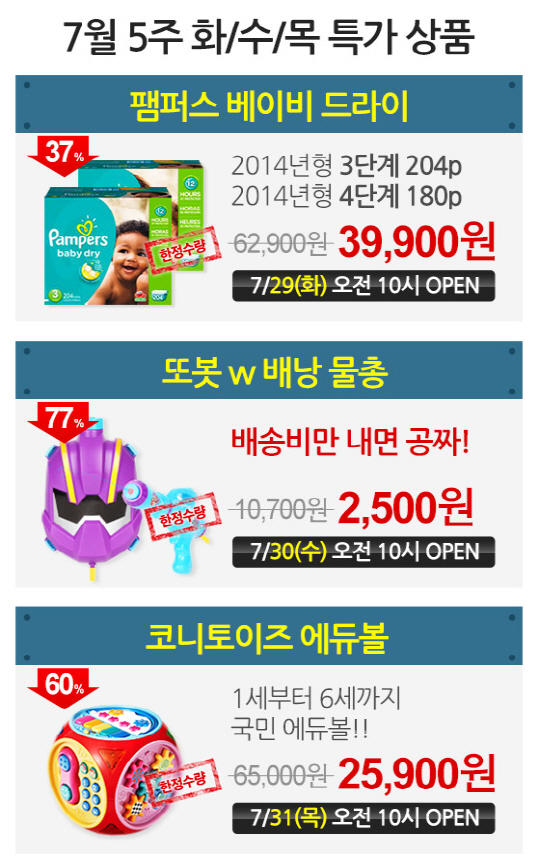 또 "간혹 저렴한 가격 때문에 상품의 질을 의심하는 분들도 계시지만, 저희는 일반적으로 판매되는 상품과 동일한 정품만을 판매한다"며 "온라인 쇼핑몰과 오프라인 매장을 통틀어 가장 저렴한 최저가와 무료배송 상품이기 때문에 육아 비용 부담에 시달리던 육아맘들에게 더없이 좋은 기회가 될 것"이라고 덧붙였다.