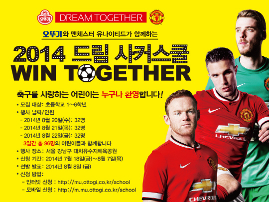 ㈜오뚜기가 맨체스터 유나이티드(이하 맨유)와 함께 어린이 축구교실 '2014 드림사커스쿨(WIN TOGETHER)'를 개최한다.
