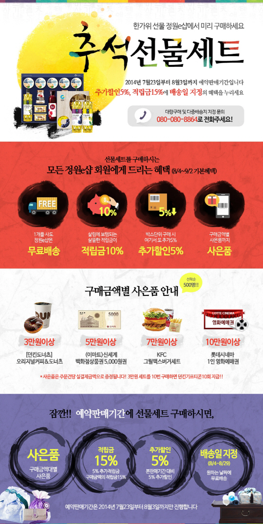 먼저 모든 선물세트를 8월 4일부터 시작되는 추석 선물세트 본 판매기간 대비 5% 추가 할인 판매하며 총 구매금액의 15%를 적립금으로 제공한다.