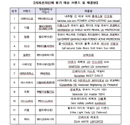 이번 평가 대상은 백화점과 원브랜드숍(한 회사와 가맹점 계약을 맺고 해당사 제품만 판매하는 상점)에서 판매중인 10개 업체의 자외선차단제 12개 제품이다.