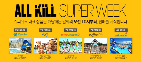 29일에는 유럽풍의 '천안 테딘 워터파크 골드시즌 입장권'을, 30일에는 남태평양 폴리네시아를 테마로 꾸민 '롯데 김해 골드시즌 입장권'을 선보인다. 또 31일에는 수도권 최고 인기 워터파크인 '캐리비안베이 골드시즌 입장권'을 판매한다.