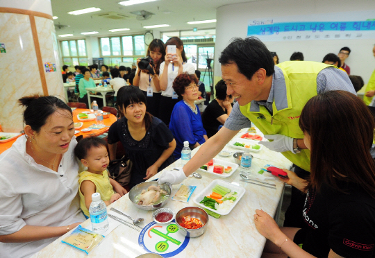 박영환 티브로드 상무가 북한이탈주민과 함께하는 건강한 여름나기 삼계탕 나눔잔치에서 어르신들에게 봉사를 하고 있다.