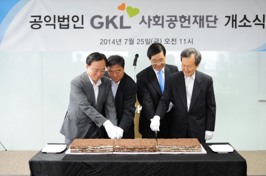 ◇GKL사회공헌재단 개소식 참석자 대표들이 떡커팅을 하고 있다. 사진 왼쪽부터 김봉기 문화체육관광부 관광국장, GKL임병수 사장, 김장실 새누리당의원, GKL사회공헌재단 이덕주 이사장