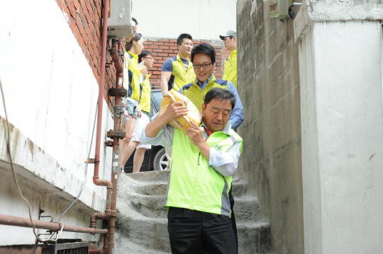 GKL임병수 사장이 지난 달 서울 서대문구 의 소외 가정을 찾아 '희망미'를 나르고 있다.