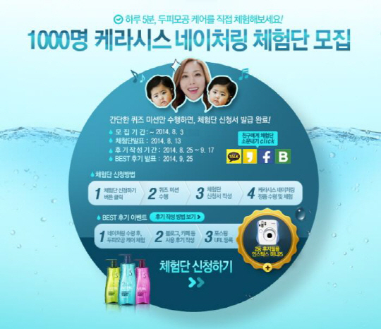 케라시스 네이처링샴푸를 무료 증정하는 제품 체험단 1000명은 케라시스 네이처링 홈페이지(http://naturing.kerasys.net/)에서 간단한 퀴즈미션을 수행한 후 신청서를 작성하면 자동으로 응모된다.모집은 8월 3일까지 진행되며, 결과는 8월 13일 홈페이지에서 확인할 수 있다. 체험단으로 선정되면 2만원 상당의 케라시스 네이처링샴푸 정품 기획세트를 보내준다.