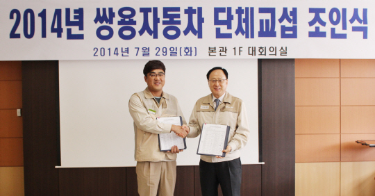 쌍용자동차는 29일 평택공장에서 2014년 임금단체협약 조인식을 갖고 노사간 협력을 다짐했다고 밝혔다. 쌍용차는 이에 앞서 지난 23일 16차 교섭을 통해 잠정합의안을 도출, 24일 업계 최초로 임단협을 타결하며 5년 연속 무분규로 임단협 협상을 마무리했다. 이번 협상의 주요 내용으로는 ▲통상임금 범위확대(정기 상여금의 통상 임금 포함) 외에, 임금 부문은 ▲기본급 3만원 인상, 별도 합의 사항으로는 ▲생산목표달성 장려금 200만원 ▲고용 안정 위한 장기적 발전 전망 ▲복직 조합원 처우개선 ▲사무연구직 조합원 근무환경 개선 등이 포함됐다. 또한 주간연속 2교대제 도입과 관련, 2교대 물량확보가 가능한 2016년 1월부로 시행하돼 제반 세부 사항은 별도 노사합의를 통해 지속 협의해 나가기로 했다.