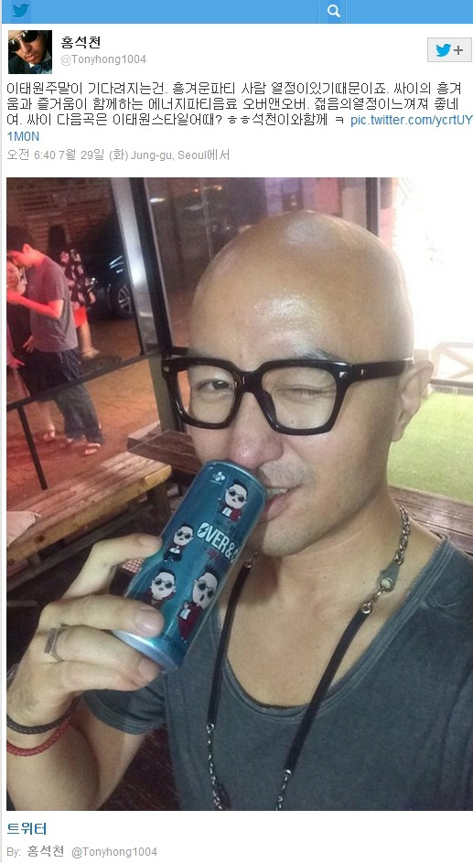 파티 마니아 홍석천이 월드스타 사이가 출시한 파티 음료 '오버앤오버'를 SNS에서 응원하고 나서 화제다. 사진캡쳐=홍석천 트위터