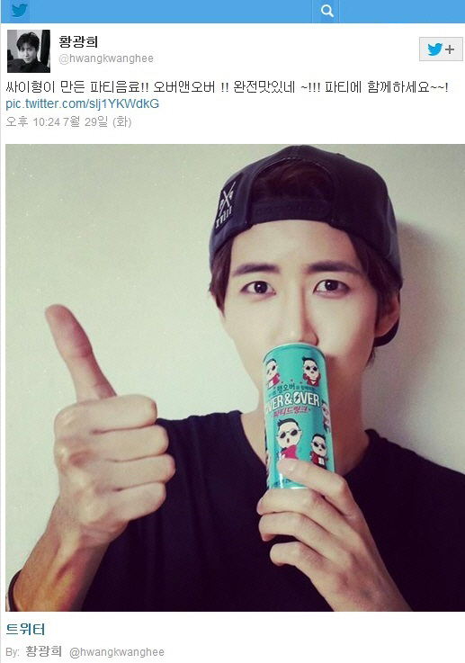 광희가 자신의 SNS에 싸이의 파티 음료 '오버앤오버'를 응원하는 사진과 글을 남겼다. 사진캡쳐=광희 트위터