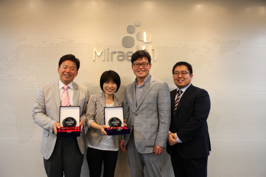 미래엔이 홍명보장학재단에 도서 1000권을 기부한 것에 대해 감사패를 받았다. 사진제공=미래엔