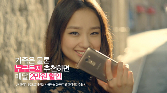 LG유플러스(부회장 이상철)가 30일 가족, 친구 및 지인을 신규가입이나 기기변경으로 추천하는 고객에게 요금을 할인해주는 'U+가족친구 할인'의 CF를 선보였다.