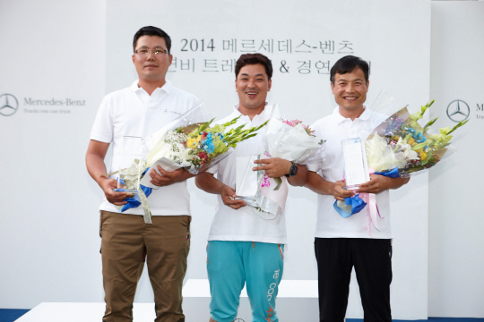 다임러 트럭 코리아㈜가 29일 인천 송도 컨베시아에서 개최한 '2014 메르세데스-벤츠 연비 트레이닝 & 경연 대회'를 개최했다. 사진 왼쪽부터 2위 심대기씨, 1위 천학수씨, 3위 김명우씨.