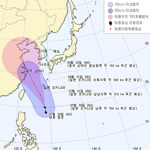 이에 따라 31일 제주도 남쪽 먼바다에는 오후부터 바람이 강하게 불고 파도도 2.0~4.0m로 높게 일겠다. 밤부터는 제주도 앞바다와 남해상에도 바람이 점차 강해지고 물결도 높게 일 것으로 보인다.