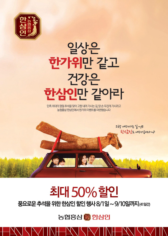 농협홍삼 '한삼인'(대표이사 안종일)은 민족 최대 명절 추석을 맞아 한가위 이벤트를 진행하고, 한삼인 제품을 최대 50%까지 할인 판매한다.