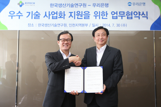 우리은행(행장 이순우)이 31일 한국생산기술연구원(이하 생기원)과 인천테크노파크 내 생산기술연구원 인천지역본부에서 우수기술 사업화 지원을 위한 업무협약을 체결했다고 밝혔다.