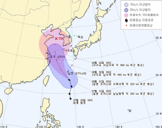31일 오전 3시 오키나와 남남동쪽 250㎞ 해상까지 접근한 나크리는 중심기압 994헥토파스칼(hPa), 중심 부근 최대 풍속 21m/s, 강풍 반경 300㎞인 중형급 태풍으로 발달해 시속 5㎞의 속도로 북서진 중이다.