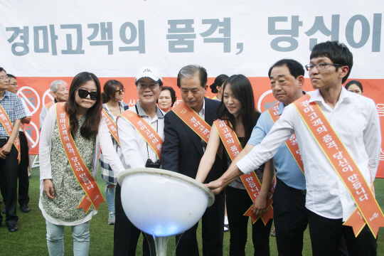 고객 리스펙트 캠페인 선포식이 개최됐다. 지난 27일 렛츠런파크 서울 9경주 종료 후 시작된 이날 행사에는 경마고객 남녀 2명이 '경마고객 에티켓 헌장'을 공표하는 등 경마고객과 마사회 임직원을 대표해 참석한 40여명이 품격있는 경마문화 조성을 위해 캠페인에 적극 참여할 것을 다짐했다.