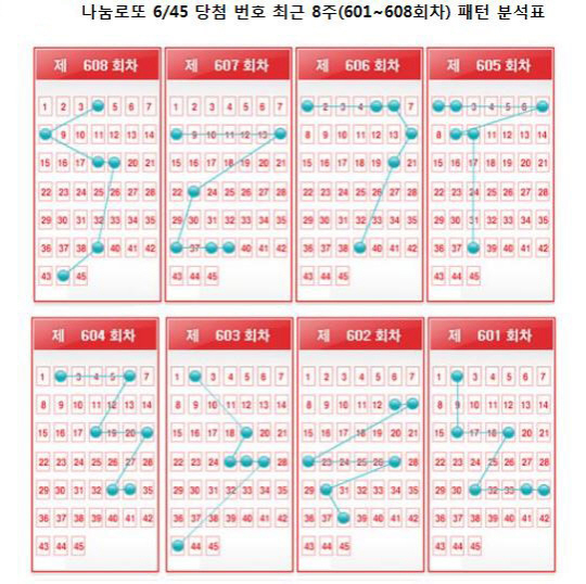 또한 최근 8건의 당첨번호 패턴을 보면 1~10 사이 숫자와 30~45 사이의 숫자에서 연속된 자리가 나온 경우가 각각 3건으로 나타나 연속 번호를 찍었을 때 10번 대와 20번 대에 비해 당첨확률이 높았던 것으로 파악됐다.