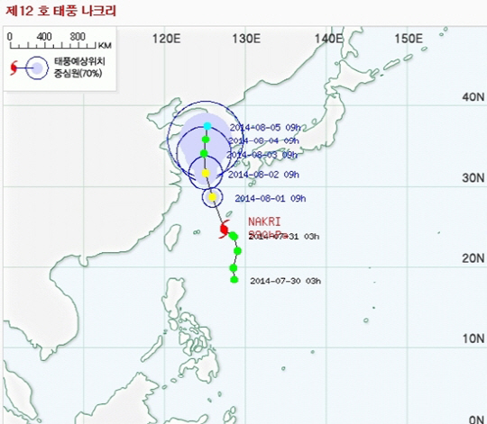 31일 오전 3시 오키나와 남남동쪽 250㎞ 해상까지 접근한 나크리는 중심기압 994헥토파스칼(hPa), 중심 부근 최대 풍속 21m/s, 강풍 반경 300㎞인 중형급 태풍으로 발달해 시속 5㎞의 속도로 북서진 중이다.