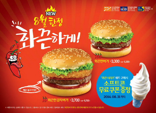 신제품 이름은 '화끈한버거'와 '화끈한감자버거'다.