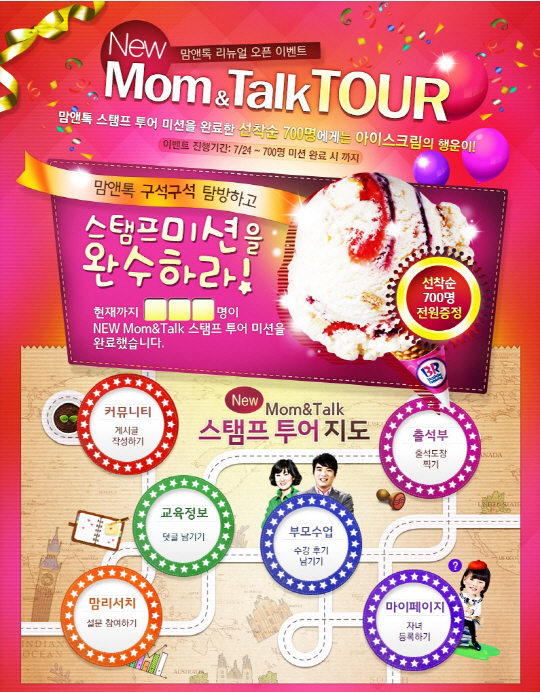 맘앤톡은 개편을 기념하여 6가지 미션을 수행하면 아이스크림을 증정하는 '스탬프 투어 미션 이벤트'를 진행한다. 미션을 완료한 선착순 700명에게는 베스킨라빈스 모바일 상품권을 증정한다.