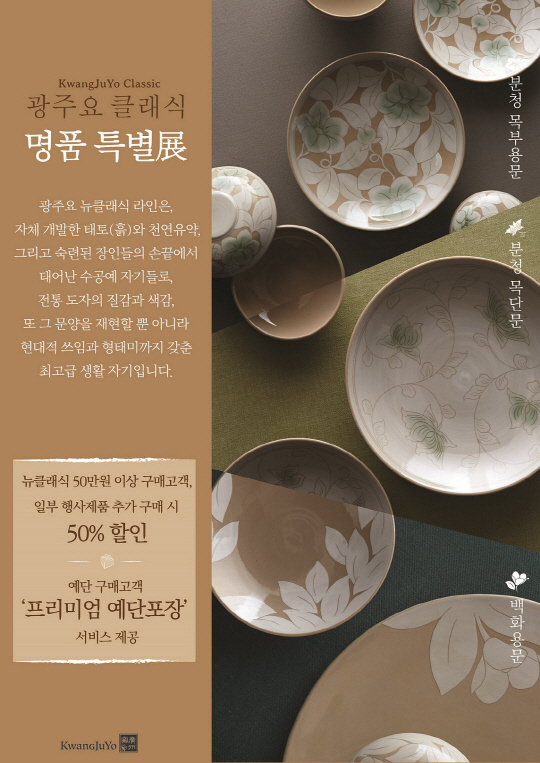 광주요 도자영업 총괄 전수진 부장은 "이번 명품 특별전은 오랫동안 클래식 라인을 사랑해 주신 광주요 고객에 대한 감사의 마음을 전하기 위해 마련했다"며 "최고급 명품자기 뉴클래식 제품을 부담 없는 가격에 구매할 수 있고, 고급 포장 서비스까지 제공하기 때문에 예단이나 혼수를 준비하는 고객에게 특히 좋은 기회가 될 것"이라고 전했다.