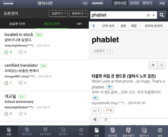 네이버(대표이사 김상헌)가 4일 네이버 영어사전에 오픈 플랫폼을 적용한 '오픈영어'를 모바일에서 먼저 선보인다고 밝혔다. 오픈영어는 이용자 누구나 영어-한국어 또는 한국어-영어 단어의 뜻풀이를 등록하고, 다른 이용자와 공유할 수 있는 사전서비스다. 아직 사전에 등재되지 않은 신조어나 유행어의 뜻풀이에 대해 이용자들이 자유롭게 질문하거나 본인이 직접 등록할 수 있다.