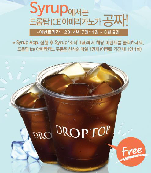 이에 시럽 모바일 어플리케이션에 접속하면 별도의 회원가입이나 조건 없이 드롭탑 아이스 아메리카노 무료 쿠폰 다운로드가 가능하며, 드롭탑 방문시 직원에게 해당 쿠폰을 제시하면 아이스 아메리카노를 무료로 제공받을 수 있다. (특수 매장 제외)