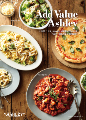 한편, 애슐리는 이번 메뉴 개편을 기념해 소비자 이벤트를 진행한다. 애슐리 공식 블로그(http://blog.naver.com/your_ashley)에 5일부터 새롭게 개편되는 메뉴를 즐기고 시식평을 본인의 블로그에 올린 후 게시물 URL을 애슐리 공식 블로그 이벤트 페이지에 댓글로 남겨 참여하면 된다. 해당 이벤트는 9월 29일까지 진행되며 이벤트 참여자 중 우수작 시식평을 작성한 50명을 뽑아 애슐리 식사권을 증정할 예정이다.