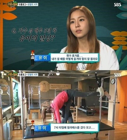 황금비율과 각선미로 주목받고 있는 '꿀벅지' 가수유이는 최근 SBS 예능프로그램 '정글의 법칙 in 인도양'에서 애프터스쿨의 유이가 필라테스로 다져진 아름다운 각선미를 자랑했다. 이날 방송에서 새벽애 필라테스를 하는 유이의 모습이 공개됐다. 레깅스에 붉은색 후드 집업을 입은 유이는 고난이도의 필라테스 동작을 척척 소화해 내 눈길을 모았다. 특히 쭉 뻗은 '11자 각선미'는 예술이었다.