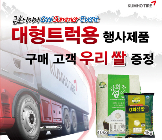 트럭버스용 타이어 구매 고객에게는 우리쌀 애용 차원에서 강화섬쌀을 사은품으로 증정한다. 12R 22.5 규격의 KRS55, KRA50, KMD21, KRA33 제품 또는 385/65R 22.5 규격 KRS50 제품을 2개 이상 구매한 고객에게는 강화섬쌀 10Kg을, 245/70R 19.5 KRS50 2개 구입 고객은 4Kg 쌀을 구매현장에서 증정한다. (구매고객 1인당 1개 증정)