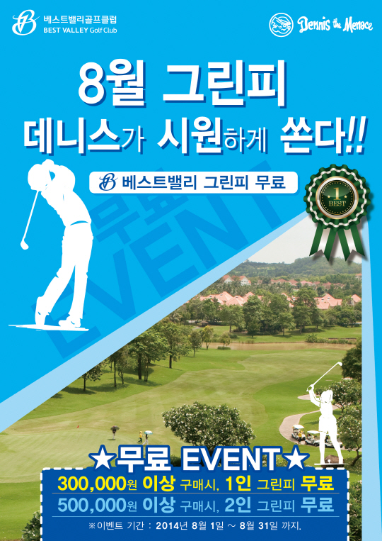 기능성 골프웨어 및 캐주얼 브랜드 데니스(대표 박노준)가 여름 이벤트를 한다. 데니스에서는 8월 한달 동안 구매고객을 대상으로 베스트밸리GC(경기도 파주 위치) 그린피를 무료로 이용할 수 있는 혜택을 제공한다.