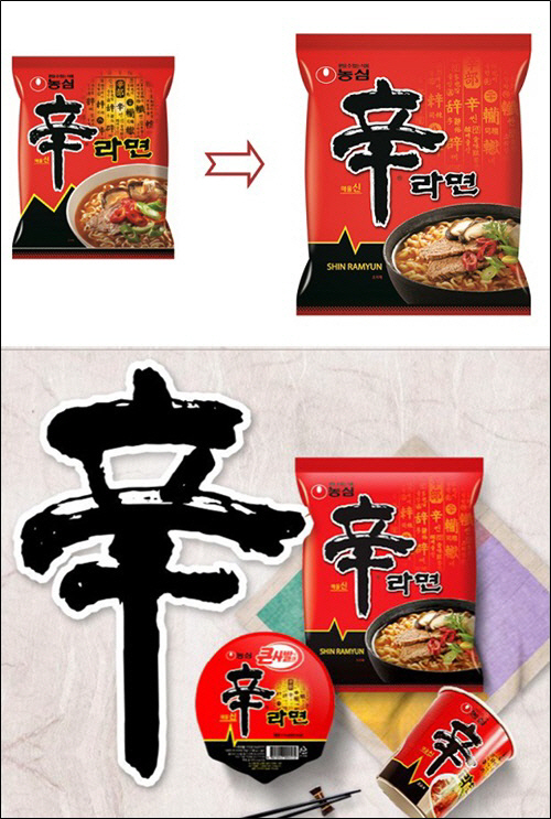신라면 포장 디자인은 손 글씨 처리한 로고인 '(매울) 辛'과 강렬한 빨간 바탕을 강조하고 나머지 디자인 요소을 과감히 생략하거나 간소화했다. 이는 신라면의 소비자 연상(聯想)을 분석한 결과 빨간 바탕에 더욱 강렬해진 '辛'자가 브랜드 자체는 물론 신라면의 특징인 매운맛을 시각상으로 강조한 것.