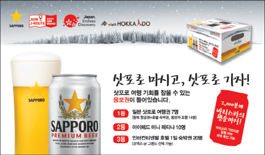 오는 9월 30일까지 두 달간 이어지는 '삿포로 마시고 삿포로 가자!' 이벤트는 한정판으로 출시된 삿포로 맥주 전용잔 기획팩 구매자를 대상으로 진행된다. 해당 기획팩은 롯데슈퍼, 롯데마트, 홈플러스 등 전국 대형마트에서 구매할 수 있으며, 패키지에 동봉되어 있는 응모권 번호를 온라인 사이트(www.sapporotour.co.kr)에 등록하면 참여 가능하다.