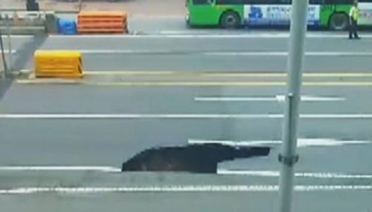 같은 시각 온라인 커뮤니티와 SNS를 통해 급속도로 퍼지고 있는 '싱크홀'의 모습은 도로 한 차선의 반 이상 구멍이 뚫려 있어 그 크기를 짐작케 한다.