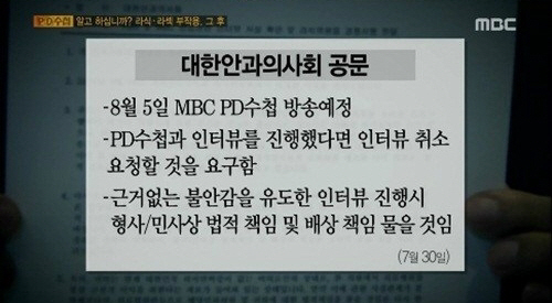 스벤 리 박사는"대한안과의사회로부터 MBC 'PD수첩'과 인터뷰를 하지 말라며, 인터뷰를 할 경우 법적 책임을 묻겠다는 공문을 받았다"고 밝혀 충격을 자아냈다.
