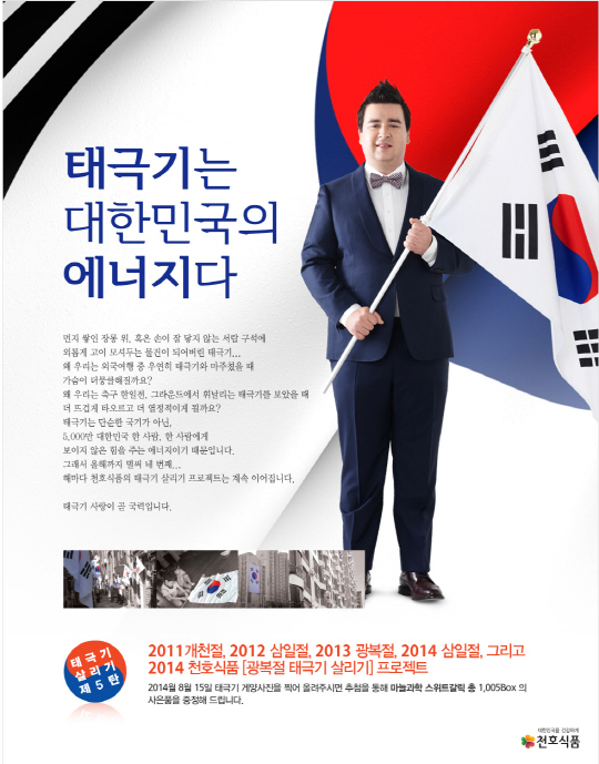 올해로 5회째를 맞은 천호식품의 '태극기 살리기 캠페인'은 매년 삼일절 및 광복절 등 국경일에 국민들을 대상으로 태극기 게양을 도모하는 프로젝트이다.
