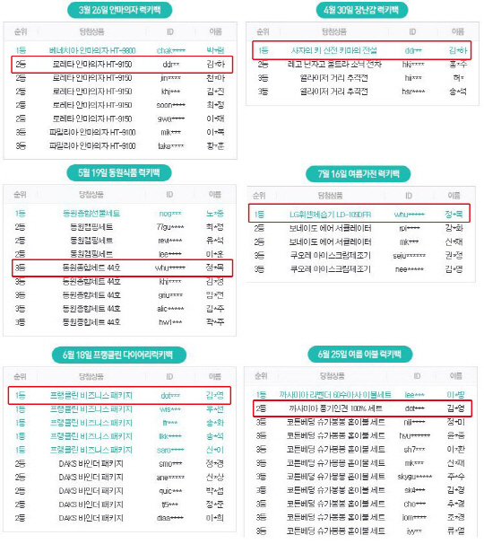 이에 스포츠조선이 올 처음 럭키백 행사를 진행한 3월17일부터 7월25일까지 54차례 이벤트 1~3등 당첨자 명단을 분석해봤다. 아이디와 이름 일부가 가려져 있지만 동일인으로 추정되는 10명의 당첨자가 두 차례씩 중복 당첨됐다. 이들은 짧게는 4일, 길게는 2개월 사이에 1~3등에 선정됐으며 받은 상품도 고가의 제품이 수두룩했다.