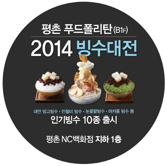 여러 가지 브랜드 중에서 빙수를 선택하여 즐길 수 있는 곳도 생겨났다. 평촌 NC백화점 지하 1층에 위치한 푸드폴리탄에서는 프랑스식 초콜릿&마카롱 카페 '모뉴망', 국내산 팥을 전통 방식으로 손수 끓여 만드는 '단빙각', 빙수의 메카라 불리는 대만 현지의 맛을 그대로 재현한 '대만빙수'에서 세계 베스트 빙수 10종을 모은 빙수대전이 진행되고 있다. 브랜드의 특성에 따라 유럽풍의 고급 빙수, 대만의 시원한 열대과일 빙수, 전통 팥 빙수까지 각양 각색의 빙수들을 골라 한자리에서 맛 볼 수 있다. 또한 푸드폴리탄의 빙수대전의 빙수를 주문하는 선착순 100명에게 매일 와플, 프레즐, 마카롱 중 1종을 증정하는 행사도 함께 진행하고 있다. 더불어 NC 평촌점 카카오스토리, 블로그(http://blog.naver.com/nc_pc/220050315919) "푸드폴리탄 2014 빙수대전" 게시물 댓글 중 1명을 추첨하여 마카롱 빙수(2인분)을 무료로 제공하는 이벤트도 진행 중이다.전상희 기자 nowater@sportschosun.com