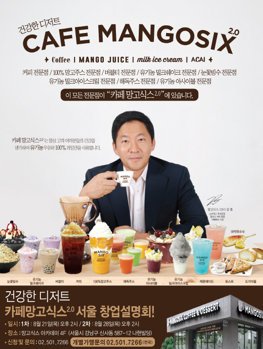 카페 망고식스2.0 창업설명회는 오는 21, 28일 오후 2시 서울 강남구 신사동에 위치한 망고식스 아카데미에서 진행되며 사전 예약(문의 02-501-7266)을 받고 있다.. 최만식 기자 cms@sportschosun.com