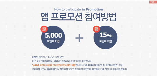 '오마이호텔 앱'을 구글 플레이에서 다운받으면 더욱 저렴하게 호텔을 예약할 수 있다. 모바일로 신규 회원가입시 5천 포인트를 지급해 즉시사용이 가능하며, 호텔을 예약하면 체크아웃 후 국내호텔 기준으로 최대 15%까지 포인트가 적립된다. 특히, PC환경서 실시간 항공, 모바일 앱에서 호텔 구매를 진행하면, 5천 포인트와 함께 제주도 호텔 5%할인과 15% 포인트 적립이라는 세 마리 토끼를 한꺼번에 잡을 수 있다.