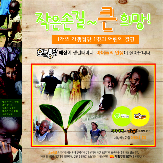오늘통닭은 최근 오늘통닭 전농점 오픈을 기념해 결연후원 아동 1명을 더 늘렸다. 이전에 오픈한 오늘통닭 은평뉴타운점, 파주 금촌점, 청량리점, 공릉점 등의 가맹점이 오픈할 때도 후원 아동을 1명씩 늘렸다. 오늘통닭은 가맹점을 오픈할 때마다 국제 비정부기구(NGO) 단체인 기아대책을 통해 탄자니아 잔지바르, 북한 나선특별시를 결연지역으로 정하고 후원을 진행 중이다. 후원금은 가맹점이 아닌 오늘통닭 본사 ㈜대현푸드빌이 전액 부담한다.