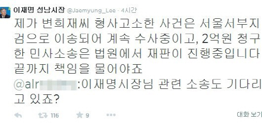 김광진 의원과 별개로 이재명 시장은 변희재 대표에게 2억원을 청구한 민사소송 등을 계속 진행할 예정이다.