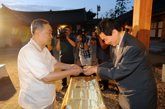 ◇우칭위안 9단의 제자인 린하이펑 9단(오른쪽)이 안영이 씨를 통해 한국에 우9단이 아끼던 붓을 전달하고 있다.