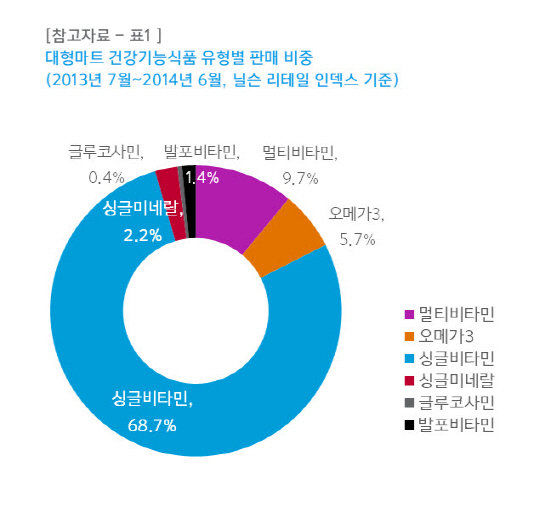 싱글 미네랄과 글루코사민 제품도 판매량이 줄어들면서 대형마트 건강기능식품 매장에서는 주로 싱글 비타민과 멀티 비타민 판매 비중(78%)이 높은 것으로 나타났다.