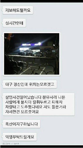 이 제보자는 "경산에서 살인사건이 일어났다. 위치는 모르겠고 범인이 분유 사러 나온 사람한테 '묻지마' 칼을 휘두른 뒤 차량을 타고 도주했다"며 "들은 거라 자세히는 모르겠다"고 밝혔다.