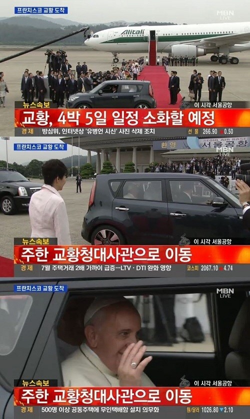 많은 네티즌들은 "프란치스코 교황 서울공항 통해 방한, 환영한다", "프란치스코 교황 서울공항 통해 방한, 의전차량은 쏘울이네", "프란치스코 교황 서울공항 통해 방한, 드디어 오셨다", "프란치스코 교황 서울공항 통해 방한, 박근혜 대통령 영접" 등의 반응을 보였다. <스포츠조선닷컴>
