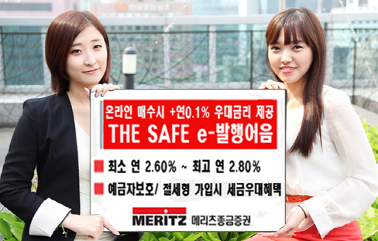 메리츠종금증권(www.imeritz.com)은 개인고객을 대상으로 온라인 상에서 발행어음 매수시 전 수익률 구간 0.1%의 우대수익률을 제공하는 'THE SAFE e-발행어음'을 판매하고 있다.